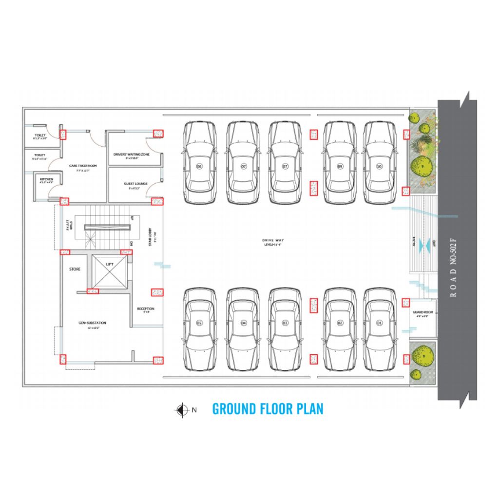 The ground floor provides a tiled approach ramp and includes plants and greenery arranged in neat planters for easy maintenance wherever possible. It has a garbage bin with convenient access for both residents and garbage collectors. Additional facilities include a drivers’ waiting area, caretaker’s room, and kitchen facilities. The building is supported by an intercom connection from the concierge to all apartments, and a security control room with CCTV coverage across the building periphery, boundary wall, and common areas inside the building.